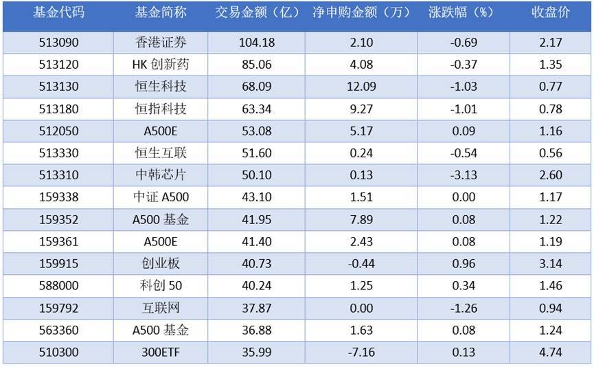 从成交金额上来看,2025年11月05日成交额最大的是香港证券(513090),交易金额104.18亿元。排名靠前的HK创新药(513120)、恒生科技(513130)、恒指科技(513180),成交额分别为85.06亿元、68.09亿元、63.34亿元。