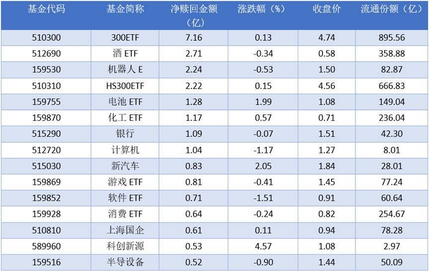 资金流出方面,2025年11月05日净赎回金额最多的是300ETF (510300),赎回金额7.16亿元。排名靠前的酒ETF (512690)、机器人E(159530)、HS300ETF(510310),赎回金额分别为2.71亿元、2.24亿元、2.22亿元。