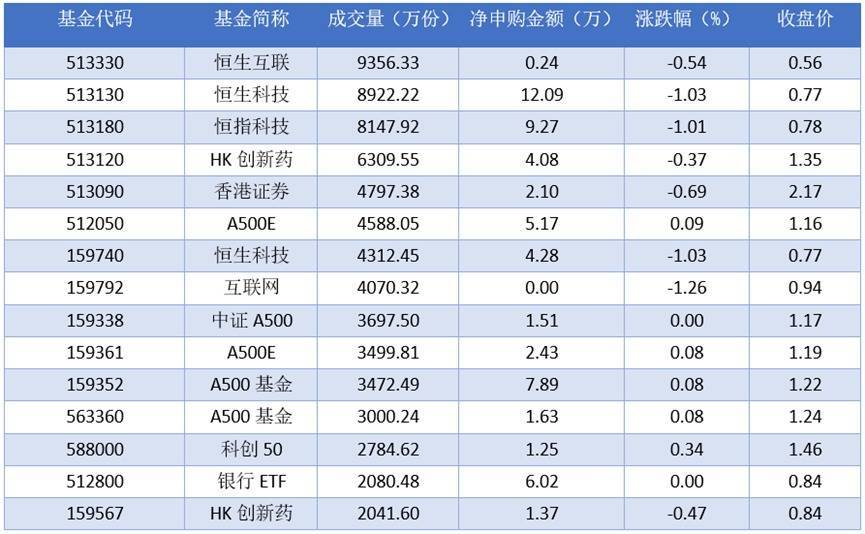从成交量上来看,2025年11月05日成交量最大的是恒生互联(513330),成交量为9356.33万份。排名靠前的恒生科技(513130)、恒指科技(513180)、HK创新药(513120),成交量分别为8922.22万份、8147.92万份、6309.55万份。