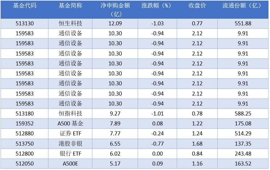 细分到资金流动情况上来看,2025年11月05日净申购金额最大的为恒生科技(513130),当日净申购金额为12.09亿元。排名靠前的通信设备(159583)、通信设备(159583)、通信设备(159583),申购金额为10.30亿元、10.30亿元、10.30亿元。