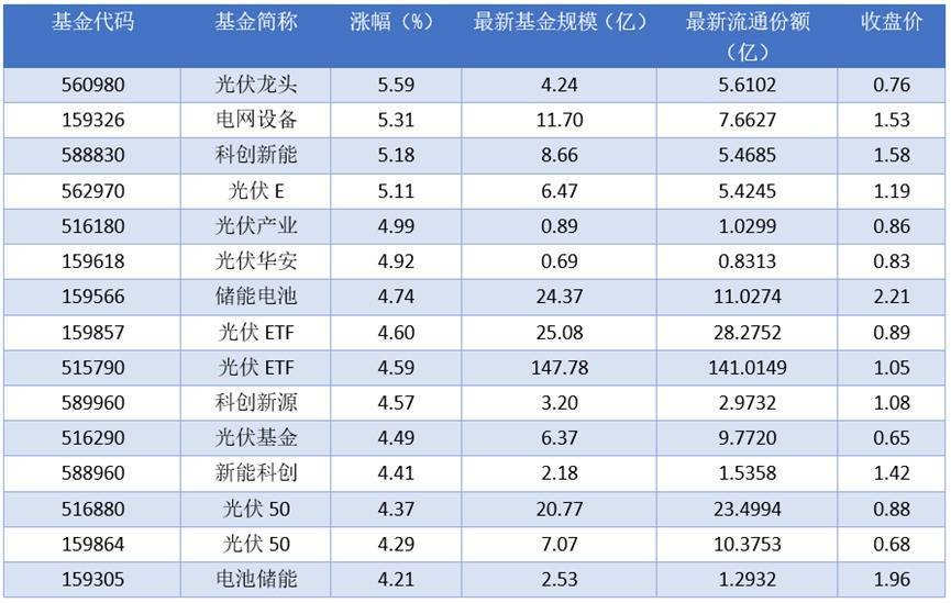 根据巨灵财经统计的数据显示,2025年11月05日场内ETF基金中光伏龙头(560980)领涨,涨幅为5.59%,排名靠前的电网设备(159326)、科创新能(588830)、光伏(562970),涨幅分别为5.31%、5.18%、5.11%。